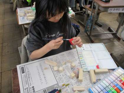 切った木片をやすったり絵の具で色付けしたりして完成に向けて頑張って取り組んでいます。