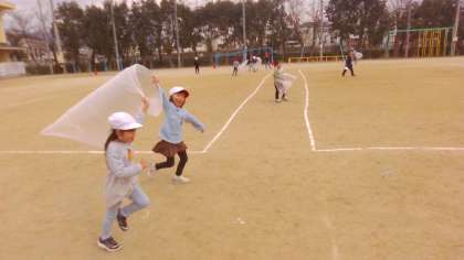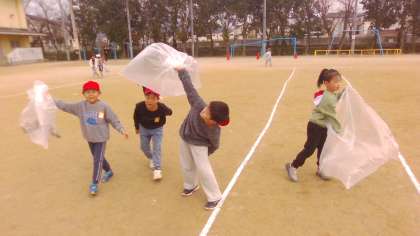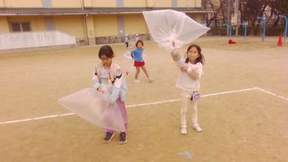 風を集めたり、2人組で走って風の力で袋を膨らませたりと身体をいっぱいを使って楽しみました。
