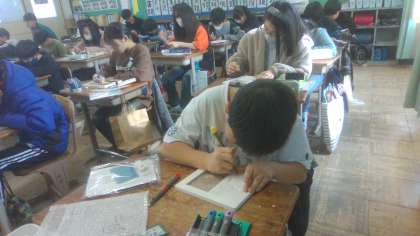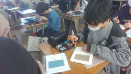 卒業制作の写真立ての制作に取り組んでいます。思い出の場面、好きな言葉など、それぞれ思い思いの絵や文字を、彫刻刀で刻んでいます。2月の作品展で展示する予定です。ぜひ、足を運び、ご覧いただけたらと思います。