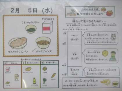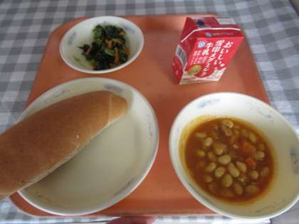 全粒粉パン、牛乳、ポークビーンズ、小松菜のソテー