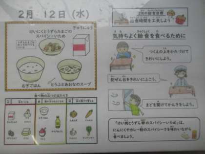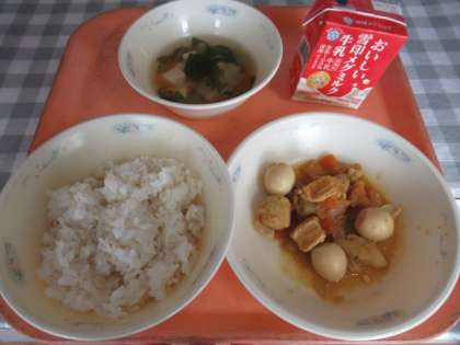 麦ごはん、牛乳、鶏肉とうずら卵のスパイシーいため、とうふと青菜のスープ
