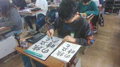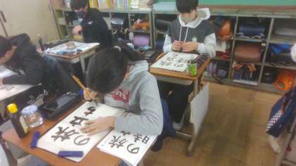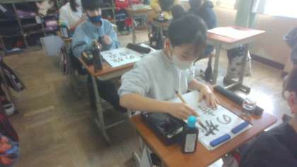 書写の授業の様子です。「旅立ちの時」自分でめあてを立て、思いを込めて書きました。