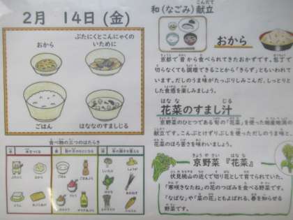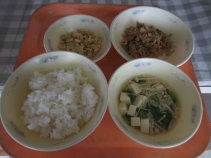 ごはん、豚肉とこんにゃくのいため煮、おから、花菜のすまし汁