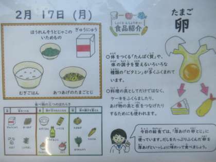 麦ごはん、牛乳、厚あげの卵とじ、ほうれん草とじゃこのいためもの