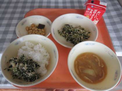 ごはん、牛乳、とりとだいこん葉のまぜごはん(具)、こんぶ豆、みそ汁