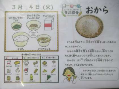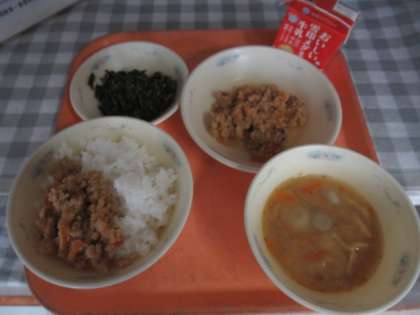 ごはん、牛乳、おからのそぼろ丼(具)、ほうれん草のごま煮、いものこ汁
