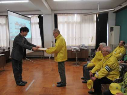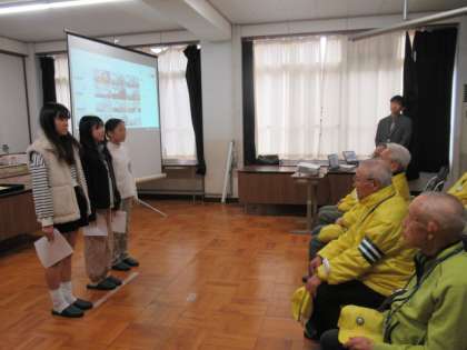 毎朝、通学路や学校の門で児童の安全を見守ってくださっている見守り隊の方々に学校を代表して運営委員会の児童が感謝の言葉を伝えました、