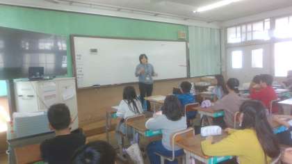 外国語担当の先生と初めての授業、楽しく頑張っています!