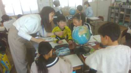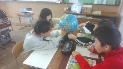 地球儀をじっくりみて、気づいたことをたくさん出し合っていました。