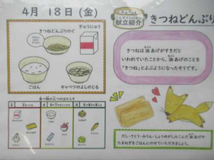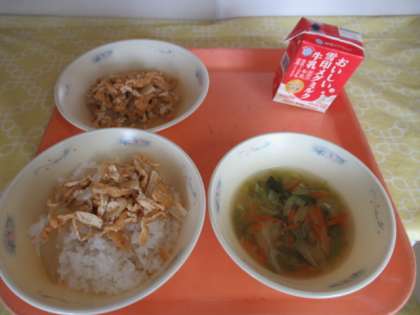 ごはん、牛乳、きつね丼(具)、キャベツの吉野汁