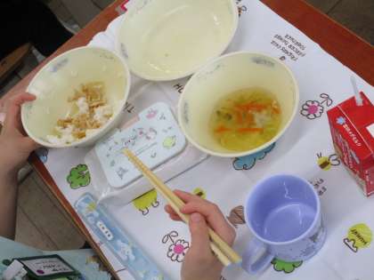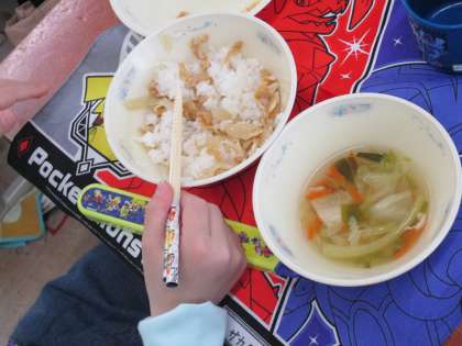 子どもたちは、どんぶりの具をご飯にかけて、美味しそうに食べていました。