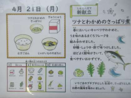 麦ごはん、牛乳、じゃがいもそぼろ煮、ツナとわかめのさっぱり煮