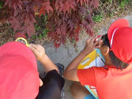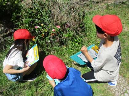 子どもたちは、虫眼鏡を使うと「大きく見えて観察しやすいよ!」と声をあげていました。時間いっぱいカードに色や形、大きさを意識して生き物を観察していました。