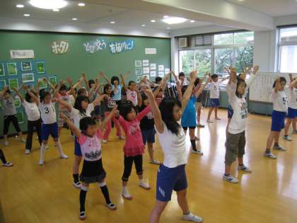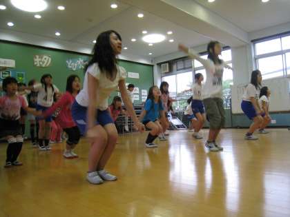 チアの基本動作『ハイブイ・ローブイ』を練習し,ジャンプの練習もしました。