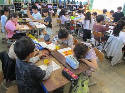 理科の学習でヒョウタンの種を観察しました。虫眼鏡を使って、小さいものを大きく見て観察カードに集中して書いていました。