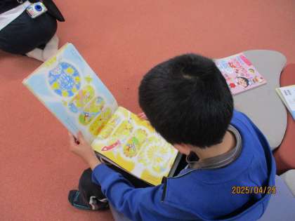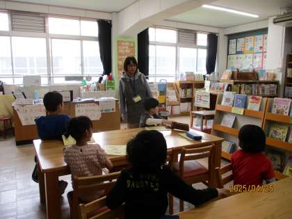 図書館で司書の先生から図書館の使い方、本の借り方、返し方の話を聞いた後、自分の好きな本を見つけて読みました。それぞれが自分の気になる本を見つけて本の世界を楽しんでいました!