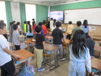 憲法集会を行いました。初めに全校合唱で『ともだちになるために』という歌を歌いました。1年生も歌詞を見ながら口ずさんでいました。