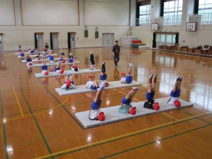 体育科の学習でマット運動を行いました。マットの運び方や学習の仕方で注意することを確認しました。その後、今まで学習してきた技を実施しました。
