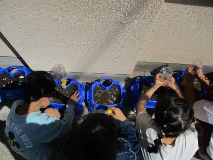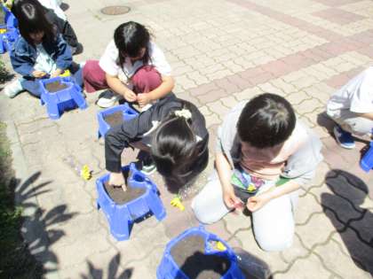 生活科の学習では、あさがおのたねを植えました。土に穴をあけ、やさしくたねを植えていました。芽が出るのが待ち遠しいです。