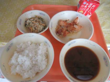 ごはん、牛乳、鶏肉のてり焼き、切干大根の煮つけ、赤だし