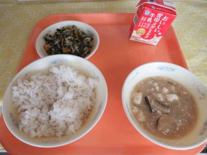 麦ごはん、牛乳、豚肉ととうふのくず煮、ほうれん草と切干大根のごま煮