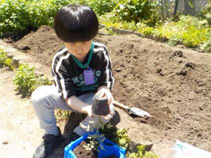 生活科の学習でミニトマトの苗を植木鉢に植えました。葉っぱの形を見たり、黄色の花が咲いているのを見つけたりしながら植えていました。