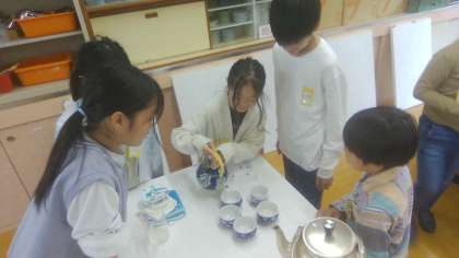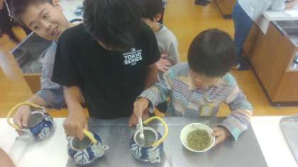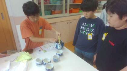 家庭科の学習でお茶をいれました。初めて家庭科室での実習だったので、はりきって活動していました。
