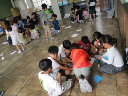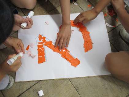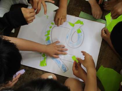 1年生を迎える会で使う「よろしくね!」のプレートをみんなで作りました。ちぎり絵でできた言葉はあたたかみを帯びています。