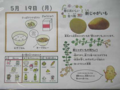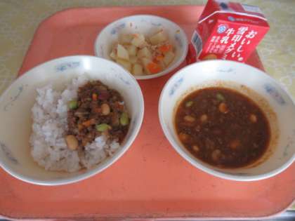 麦ごはん、牛乳、キーマカレー、さっぱりツナポテト