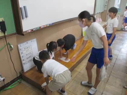今日から掃除が始まりました。6年生に教えてもらいながら、一生懸命頑張ることができました。これからも教室をピカピカにしてほしいです。