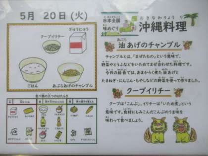 ごはん、牛乳、油あげのチャンプル、クーブイリチー
