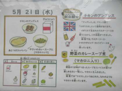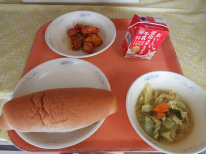 味つけコッペパン、牛乳、チキンのアングレス、野菜のカレースープ煮(マカロニ入り)