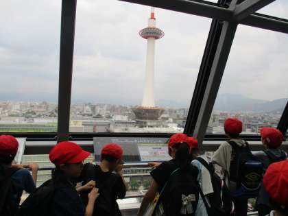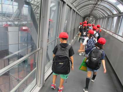 お弁当を食べた後は、空中経路スカイウェイに行きました。京都駅ビルの西側と東側をつなぐ全長185mの空中廊下です。高さ45m、京都駅ビル10階部分に位置し、京都の北側の街並みを一望できるロケーションが見どころだそうです。