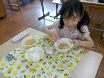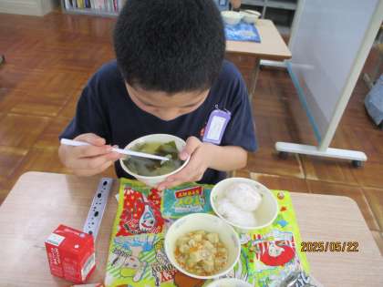 自分たちで作ったおにぎりとおみそ汁、「おいしい!」と味わって食べていました。またぜひお家でも作ってみてくださいね。