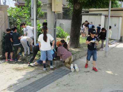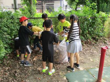 5月30日は「ごみゼロの日」です。そこで、4年生は運動場の「みどりの広場」辺りの草抜きをしました。