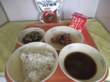 麦ごはん、牛乳、なま節のしょうが煮、ほうれん草ともやしのごま煮、赤だし