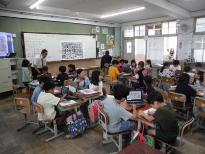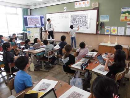 社会科の学習で、スーパーマーケットにお客さんがたくさん来る工夫を考えました。店内のイラストから気づいたことや、自分たちの経験をもとに話し合っていました。