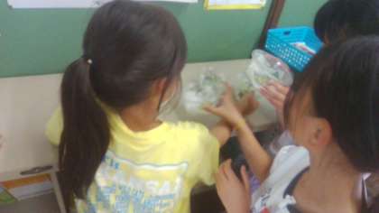 休み時間に理科の学習で育てているモンシロチョウのお世話をしている子たちがいました!