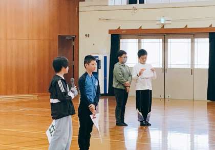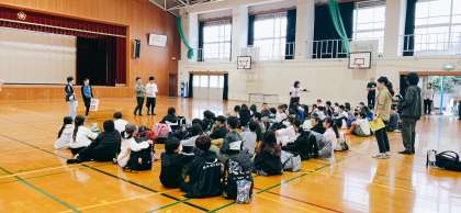 体育館で出発式をした後、花背山の家に出発します。気をつけていってきます。