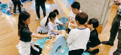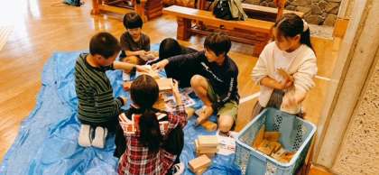 アーチ作りに取り組んでいます。支柱のないアーチを組み立てるためにはグループの協力が必要です。
