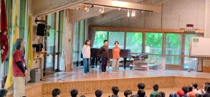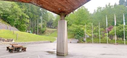 2日目が始まりました。今は雨が降っていますが午後には止むようです。梅津北小学校以外に3つの学校が宿泊していますので、合同で朝のつどいをしました。2枚目の写真は梅津北の学校紹介をしているところです。
