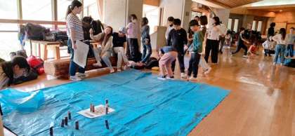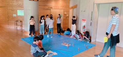 グループ対抗でモルックを楽しんでいます。モルックとはフィンランドの伝統的な遊びを元に開発されたスポーツで、木の棒「モルック」を投げて、数字の書かれたピン「スキットル」を倒し、点数を競うゲームです。初めて取り組む子どもたちも多く、楽しんでいます。