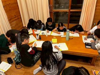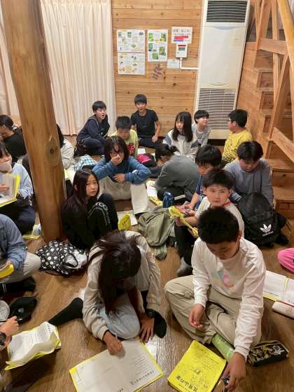 2日目のふり返りをしています。楽しかったことやがんばったことだけでなく、できなかったことや明日がんばることも出し合いました。