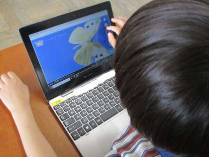 理科「チョウを育てよう」の学習で、タブレットを使ってモンシロチョウの成虫の様子を調べました。写真や動画がたくさん載っている「ものすごい図鑑」というインターネットサイトで調べました。