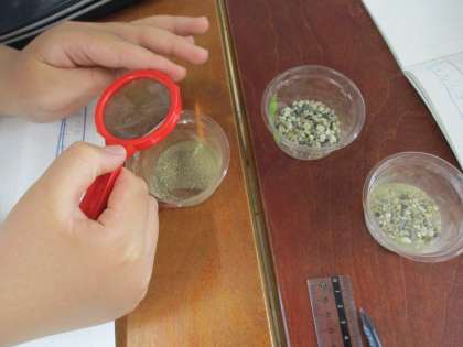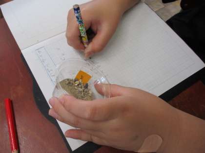 理科の学習で「校庭の土」「砂場の砂」「じゃり」を比べて観察しました。それぞれ、つぶの大きさが違うことに気づいていました。
