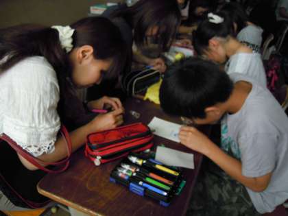 鏡文字で線描きしたり、切り出し刀でゴムを削ったりする作業にはじめは苦戦していましたが、最後は自分だけの味わい深い判子ができあがりました。