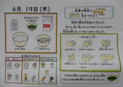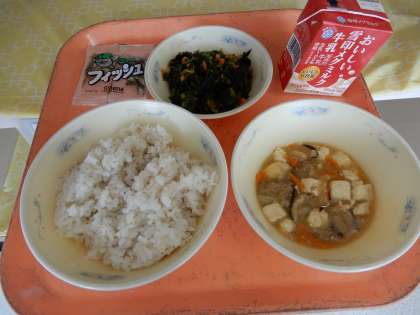 麦ごはん、牛乳、五目どうふ、ほうれん草のいためもの、じゃこ