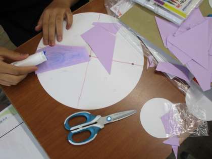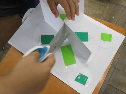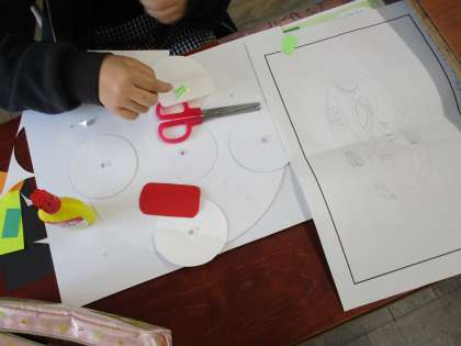 わりピンで紙と紙をつなぎ、どんな動きができるのか、どんなことが表せるのかを考えて作りました。