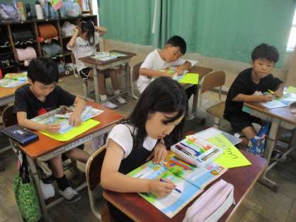 自分の虹を、I like….を使って紹介し合いました。自分の虹と比べて、同じ虹でもその捉え方は多様であることや、違いを認め合うことの大切さなどにも気付くことができました。