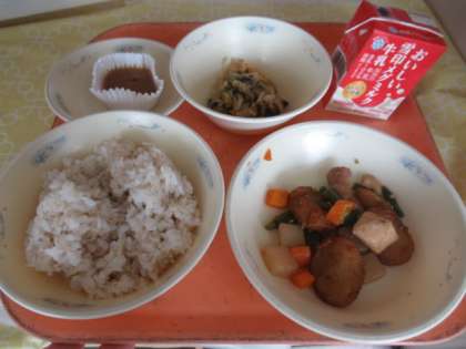 麦ごはん、牛乳、平天とこんにゃくの煮つけ、切干大根の煮びたし、ういろう(黒ざとう)